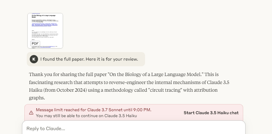 Thank you for sharing the full paper "On the Biology of a Large Language Model." This is fascinating research that attempts to reverse-engineer the internal mechanisms of Claude 3.5 Haiku (from October 2024) using a methodology called "circuit tracing" with attribution graphs.