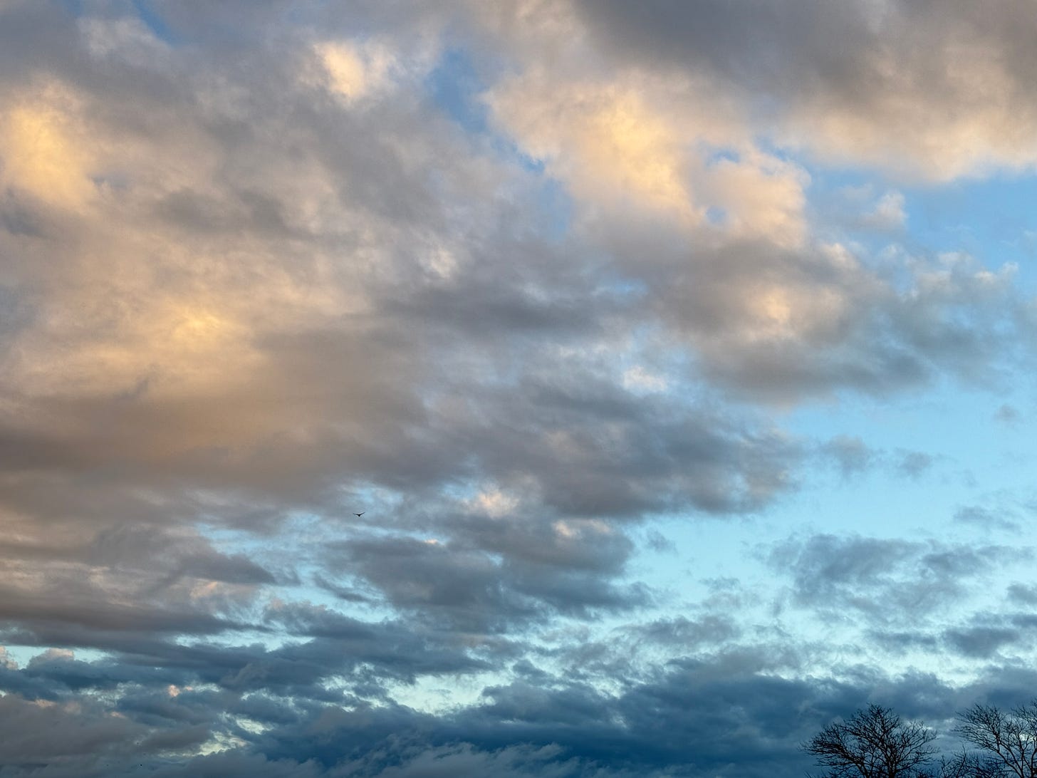 Now I’m up and making my coffee. The morning is overcast in the most hopeful way possible, thick clouds that brought us rain overnight starting to break up, moving at medium speed overhead out to sea. There are several layers… heavy, thick, slow moving… and the lighter whispy ones that are in more of a hurry to head towards England. The water is boiling, even before I can put together my drip cone setup, but this is not the morning to fret about not getting everything done on cue. Maybe this is a morning when I give myself grace and just chill the fuck out.