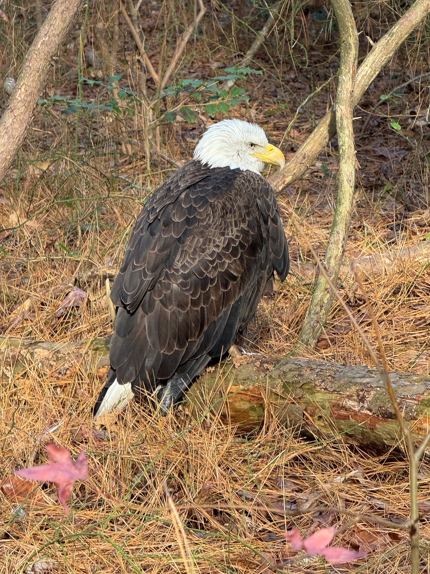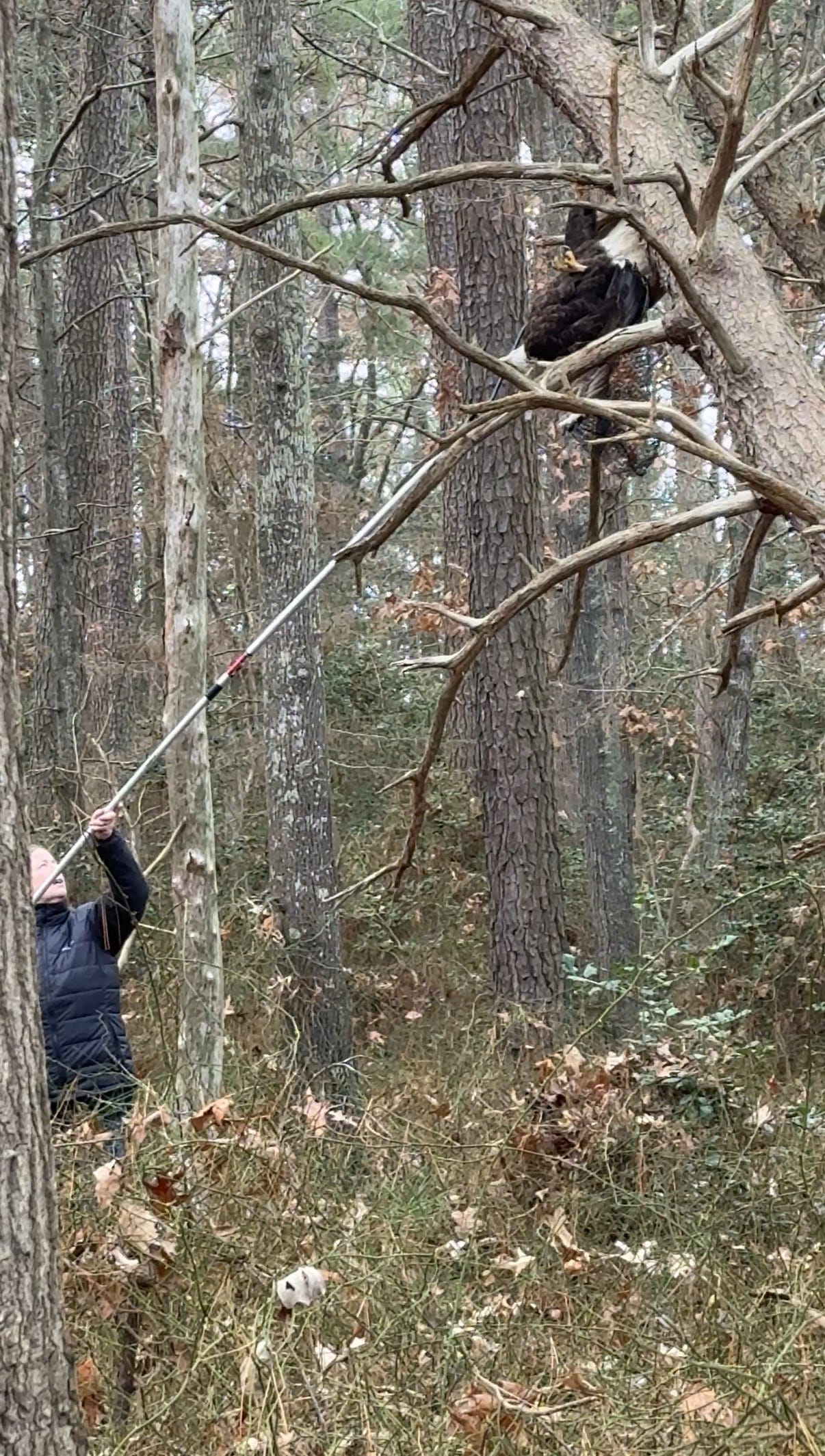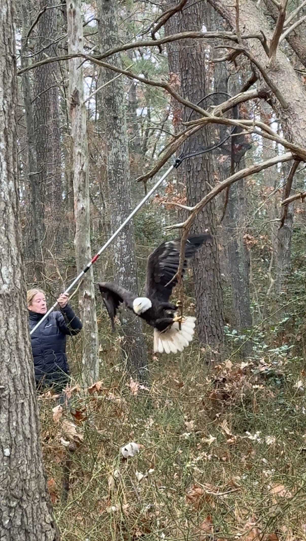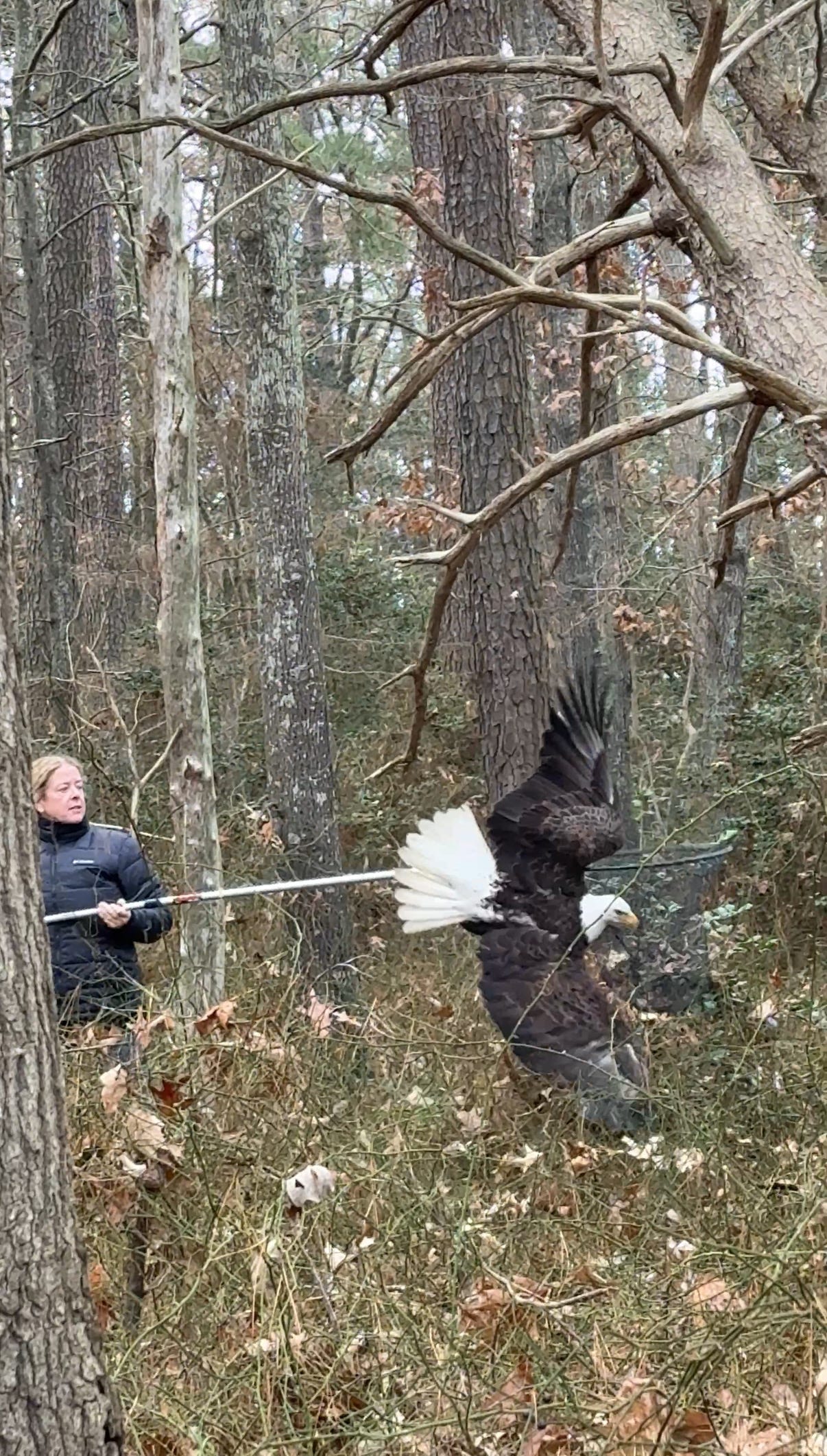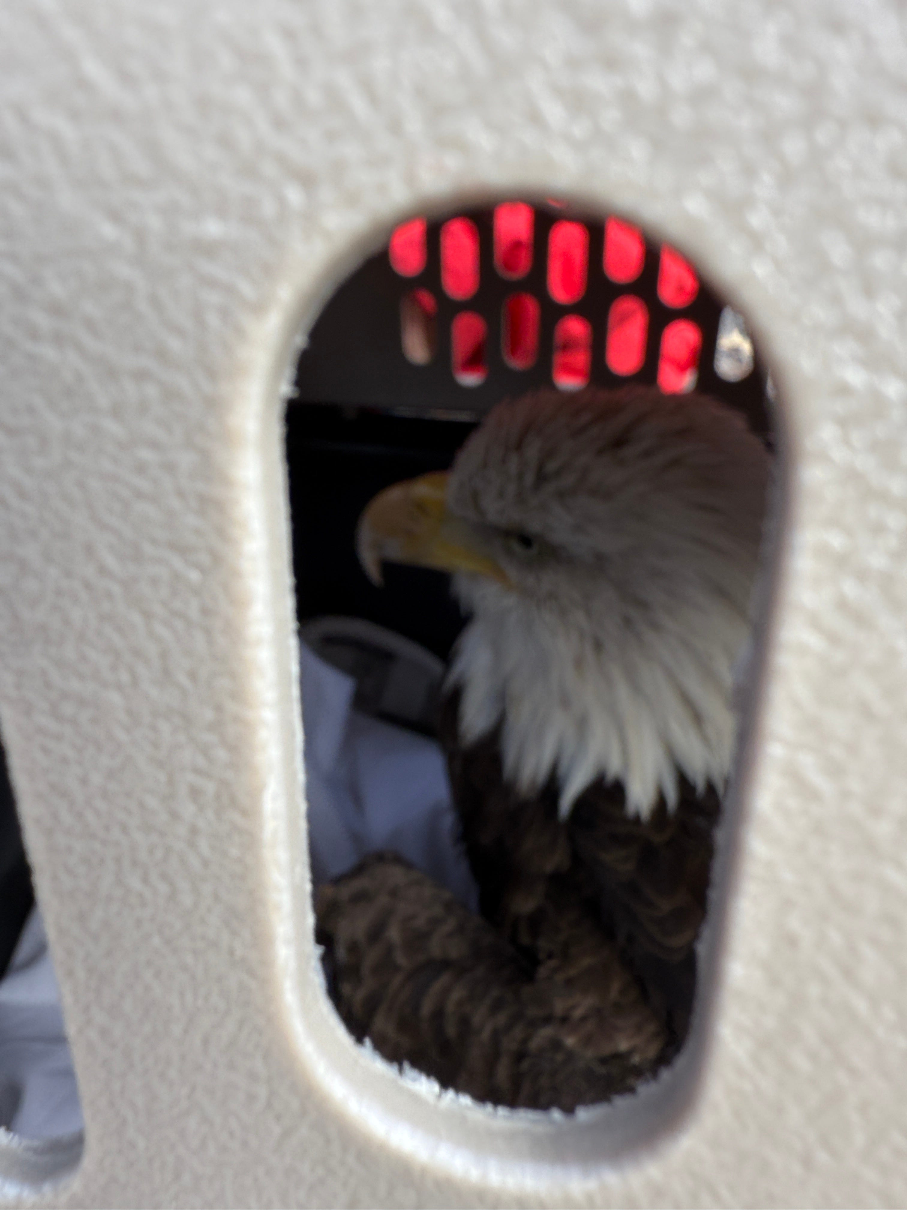 And the eagle landed… safe and sound in a carrier so it can be transferrred safely for rehab.