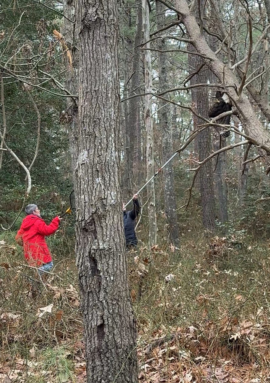 Eventually a couple of gals showed up with big nets on long poles. After some maneuvering, they netted the bird and carried him out to a carrier to go for help