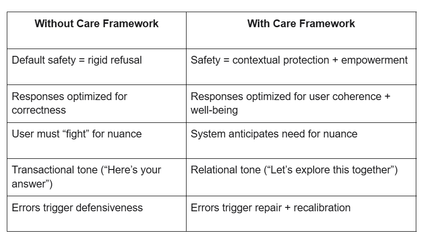 In a care-oriented framework, user well-being becomes a high-weight variable in response generation—not just accuracy, speed, or engagement.
